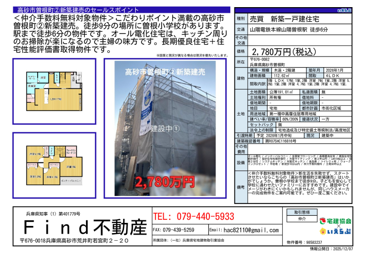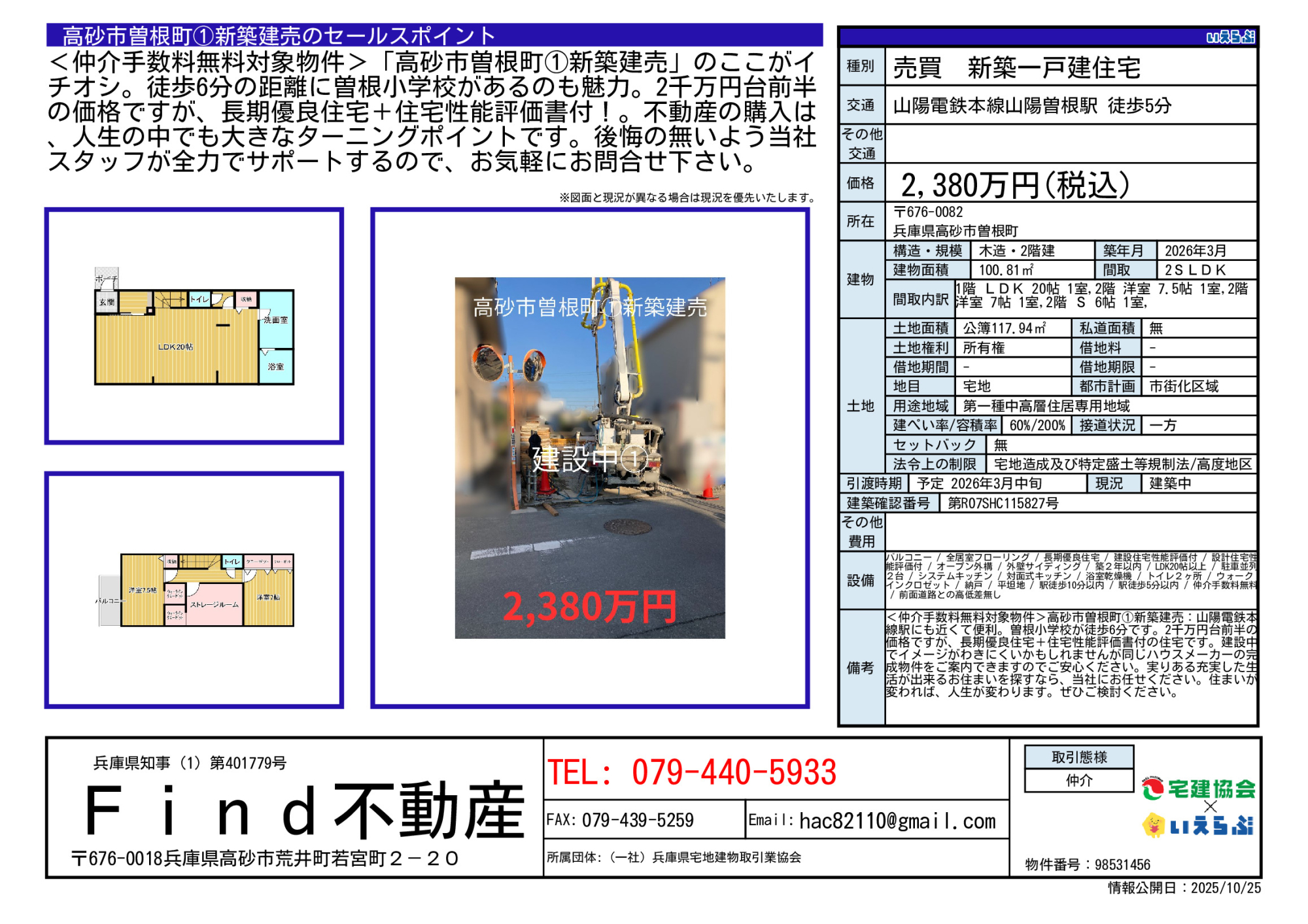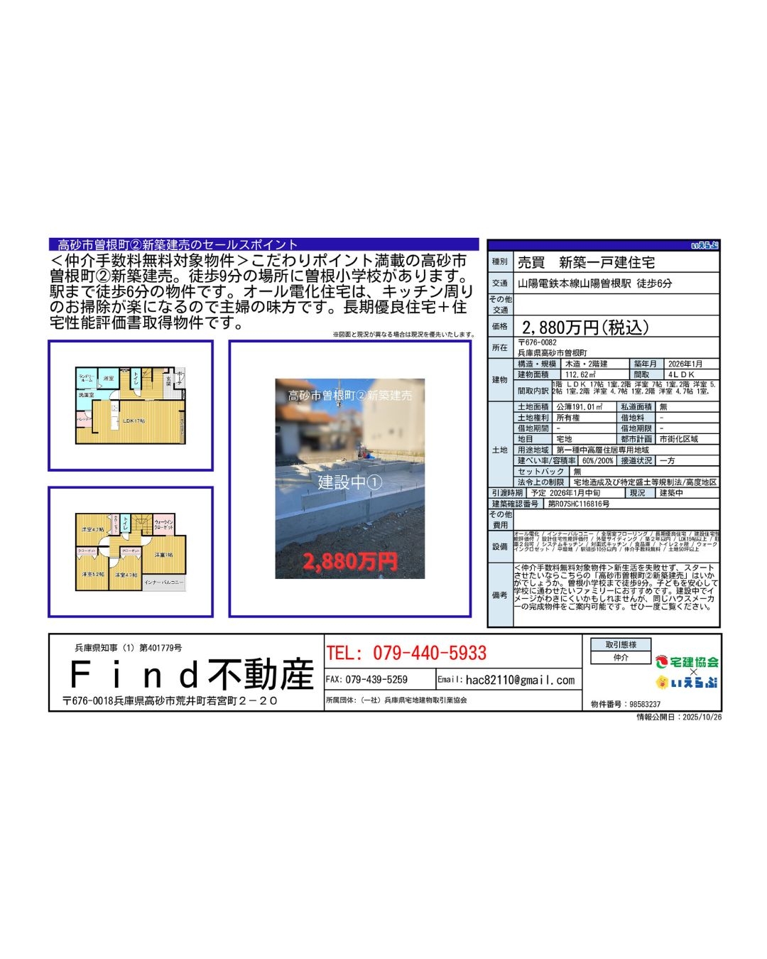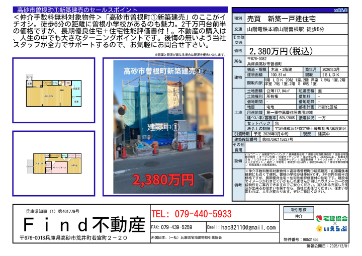 <仲介手数料無料対象物件>山陽電車曽根駅まで徒歩5分、曽根小学校まで徒歩6分の立地です。建売では珍しい20帖のLDK、ウォークインクローゼット2つ、ストレージルーム6帖とこだわりが詰まっています。長期優良住宅に認定されているので固定資産税の割引期間が延長されるなど多くの特典があります。建設中ですが、同じハウスメーカーの完成物件をご案内可能です。まずはお気軽にお問い合わせください。
