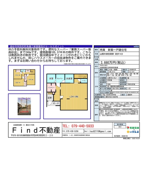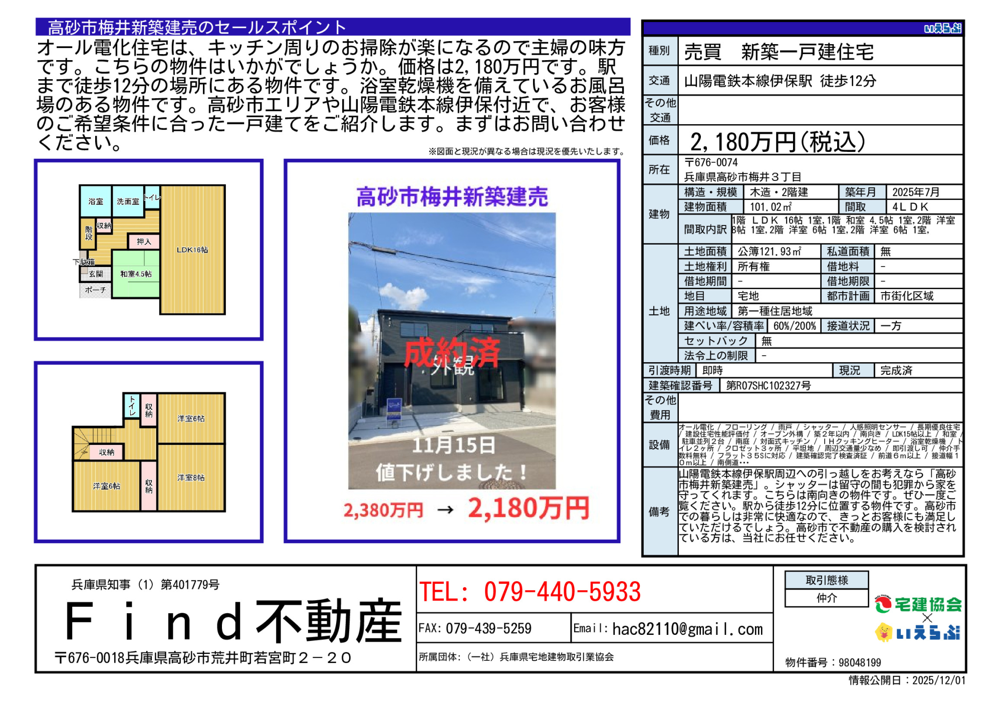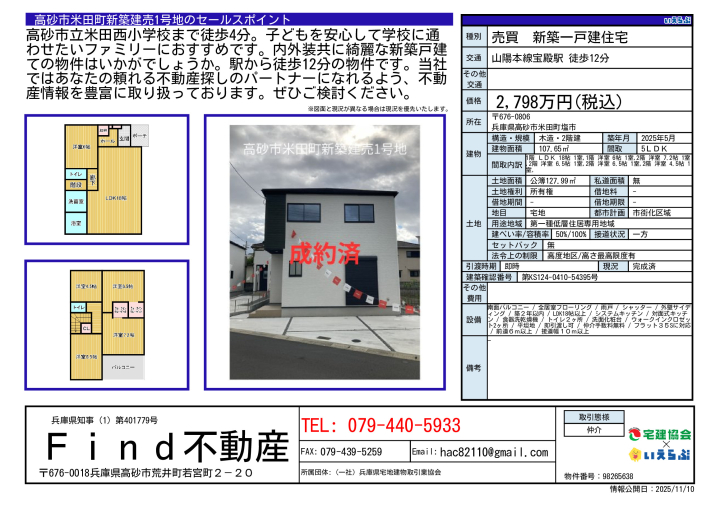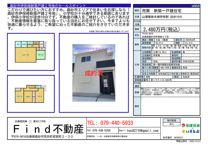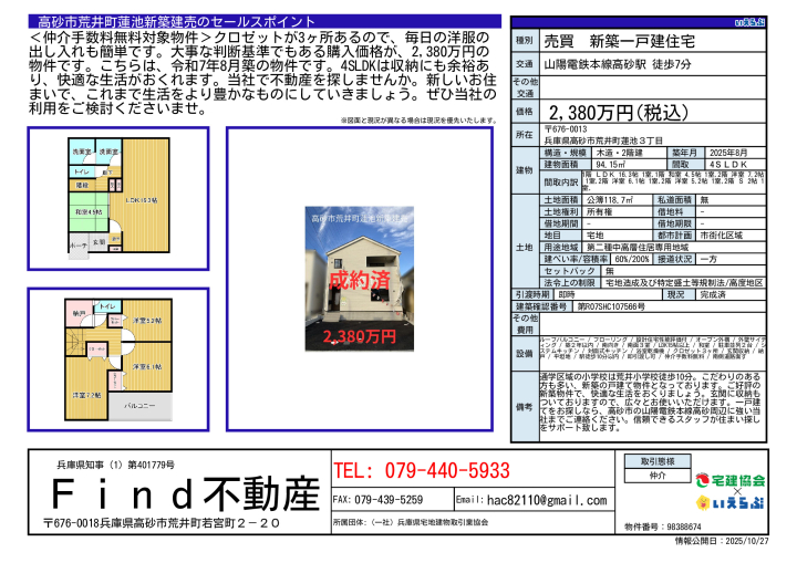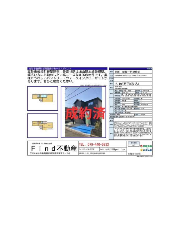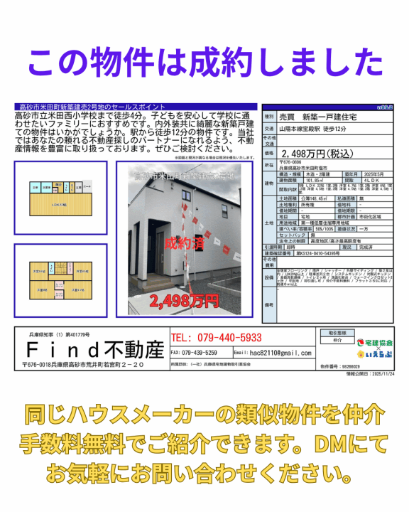 この物件は成約済です。類似物件を仲介手数料無料ご紹介できますので、電話079-440-5933もしくはホームページのお問い合わせにてお問合せください。
