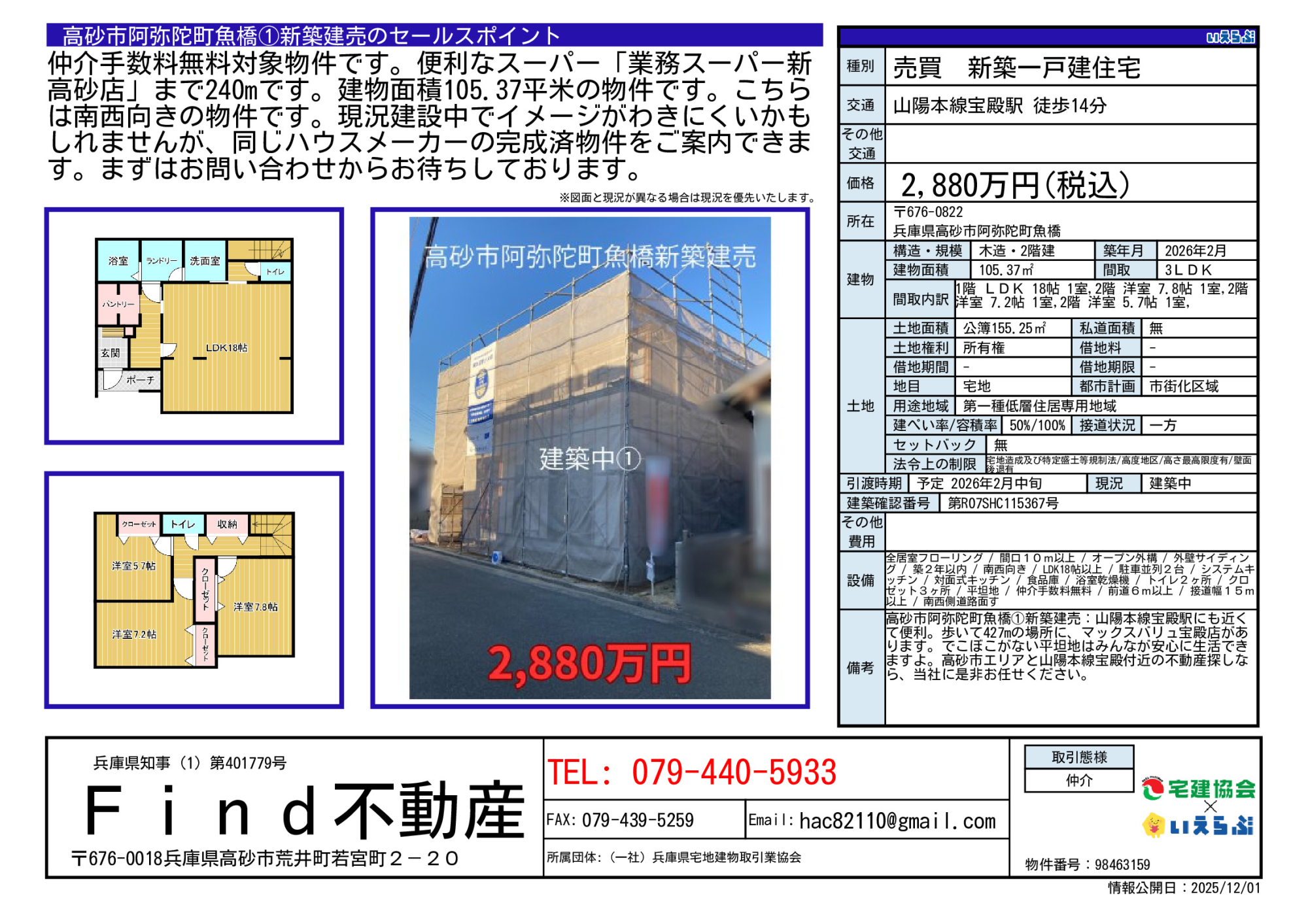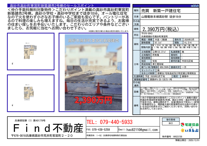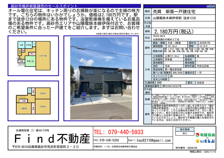 山陽電車高砂駅(特急停車駅)徒歩7分、南向きの物件です。ルーフバルコニーは突然の雨でも小雨なら洗濯物を守ってくれます。LDKの収納スペースはパントリー(食品庫)としても利用できます。建売では珍しいトイレに造り付けの小物入れがあります。住宅性能評価書取得物件!ぜひ一度ご覧ください!